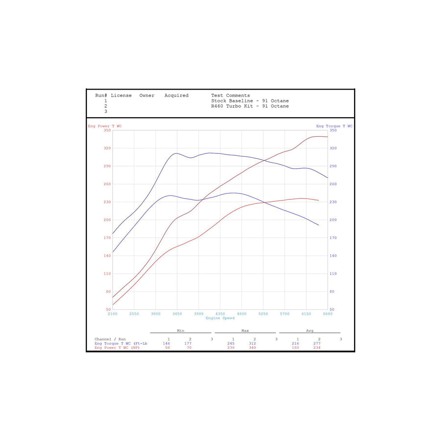 Designed as a turn-key solution for discerning enthusiasts, R460 safely delivers more power and quicker acceleration, without sacrificing response or reliability. Providing significant increases in horsepower and torque past 4,500 RPM, the R460 Hybrid Turbocharger System shines on track where the factory turbocharger can't keep up. With a focus on retaining quick spool and excellent transient response, R460 offers a broad, usable powerband - instead of introducing lag in pursuit of large peak power figures.
