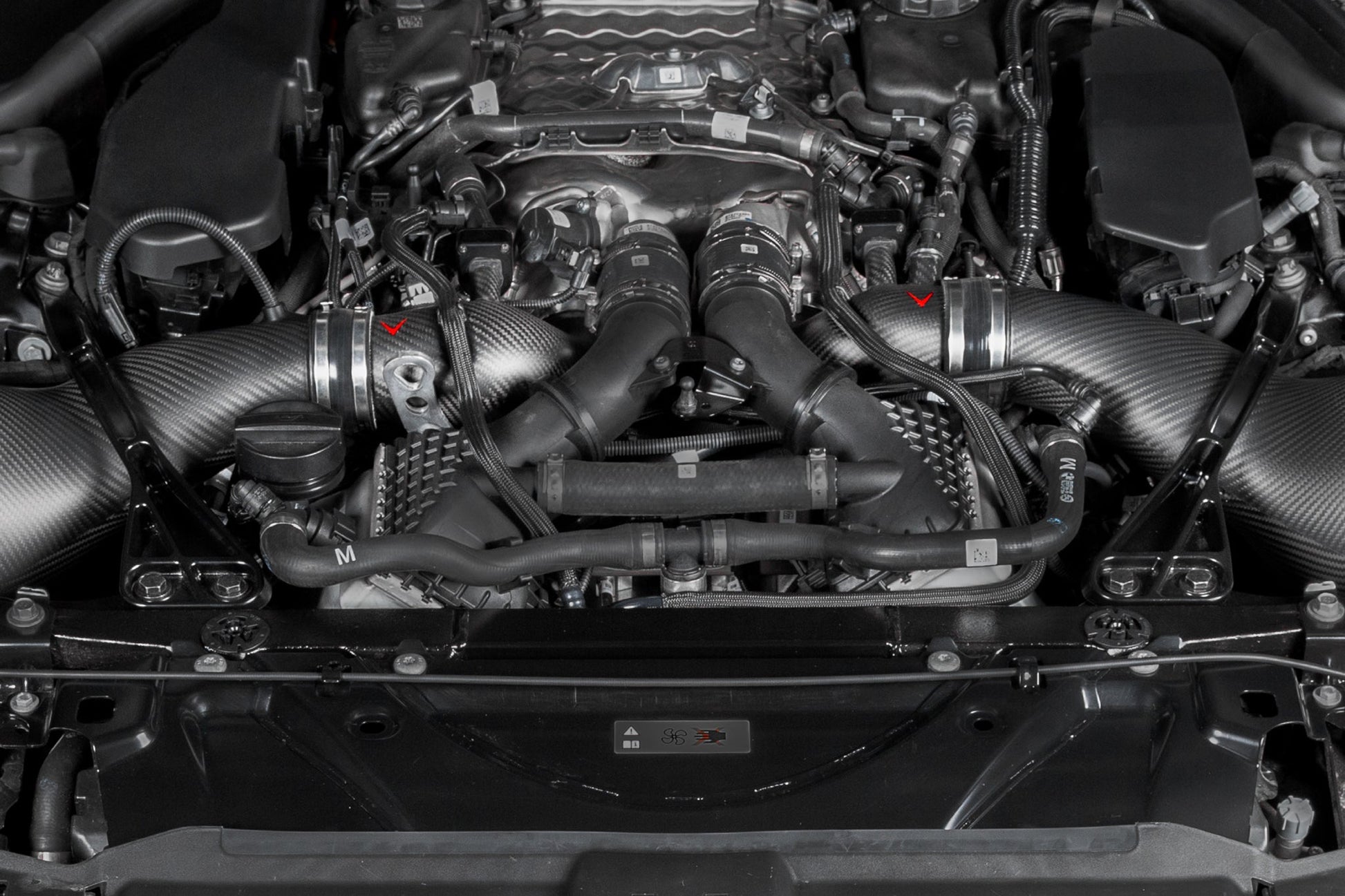 Presenting the perfect addition to our G9X M5 intake system to optimise the flow path all the way to the turbos. The OEM inlets exhibit a reduction in diameter immediately downstream of the intake connection, which can restrict airflow, particularly at elevated boost pressures. Our carbon fiber inlets address this restriction by maintaining a consistent, larger cross-sectional area and therefore there is a larger captured volume of air directly in front of the turbos. Furthermore, the curvature of the inlets has been optimized to minimize flow resistance, promoting smoother airflow to the turbochargers. Made from prepreg carbon fiber with CNC machined flanges, the inlets also provide an aesthetic improvement to the engine bay.
