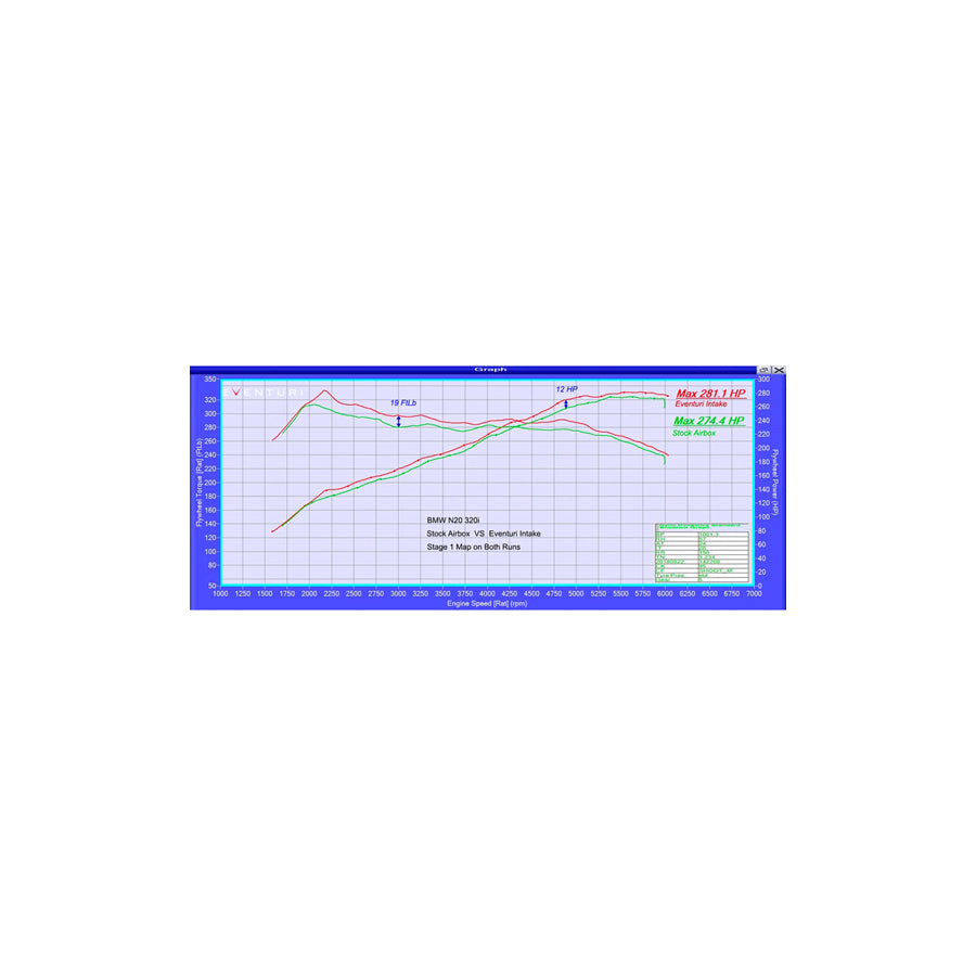 Below is a dyno graph showing the comparison between the Eventuri and the stock airbox on an F series 320i with a stage 1 remap. As you can see, power and torque are increased through a large portion of the rpm range. This translates on the road to increased part throttle and full throttle response with the car pulling much more eagerly to the redline. The testing was done on the same day back-to-back and temperatures were monitored to ensure consistency. The bonnet was closed for all runs
