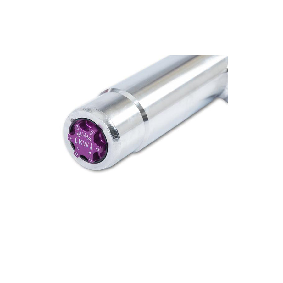 The rebound adjuster knob provides 16 precise clicks to personally dial in your desired vehicle setup. Thus allowing you the possibility to influence wheel/tire loads or take into concern chassis characteristics. Independent from rebound adjustment is the compression dampening, 12 precise adjustment clicks are provided to adjust the low-speed dampening. Most notably used to dial in wheel/tire setup.