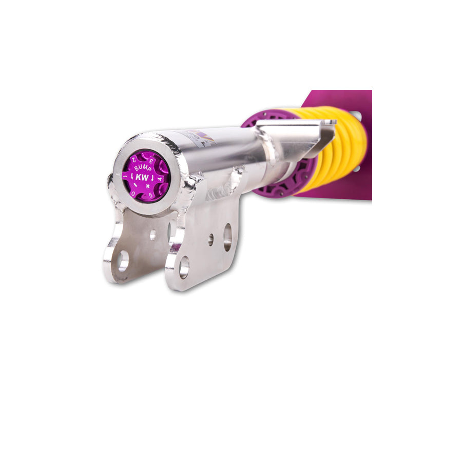 The KW Clubsport 2-way and KW Clubsport 3-way (with separate reservoir) provides the user numerous adjustment settings. This allows to user to dial the suspension setup to his/hers driving style and to adjust or match the tire/wheel setup of the vehicle.